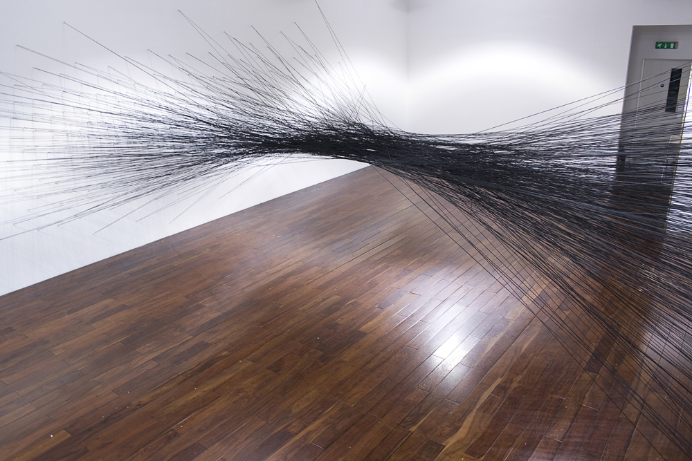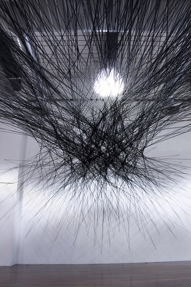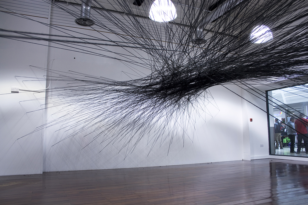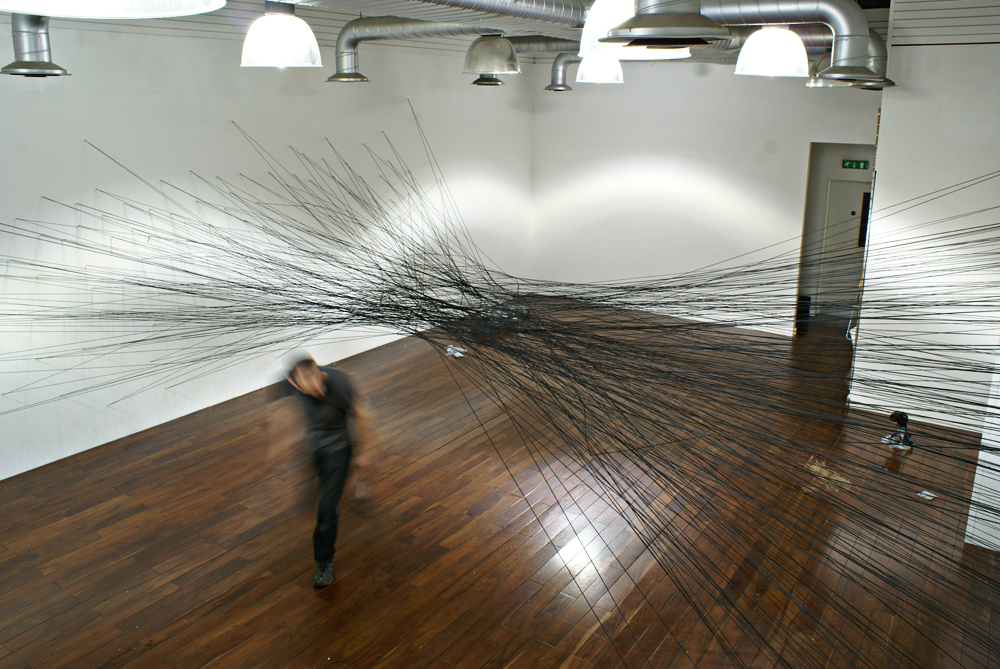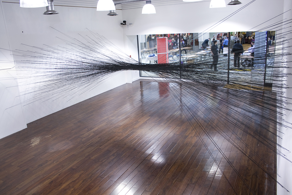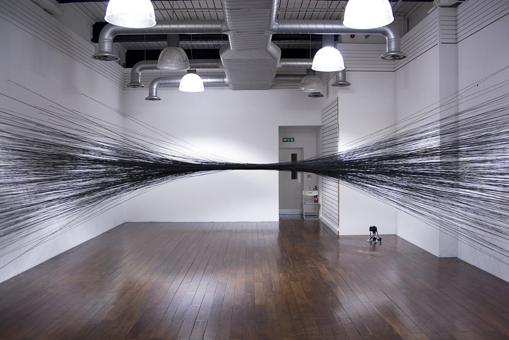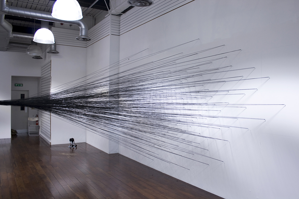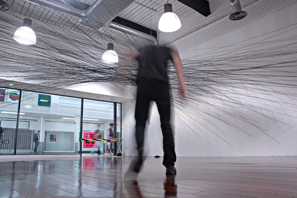The work was constructed from material sourced in the shopping centre. Its form was dictated by the properties of this material and Rich's attempt to locate and build towards the centre of the room using the outdated navigational method of dead reckoning, which uses your previous position, your estimated speed and your assumed direction to plot your current location. This method can easily become inaccurate as speed is not constant and drift cannot be accounted for - errors become compounded.