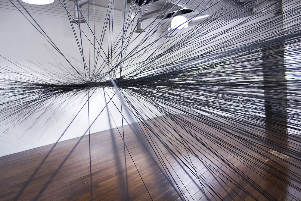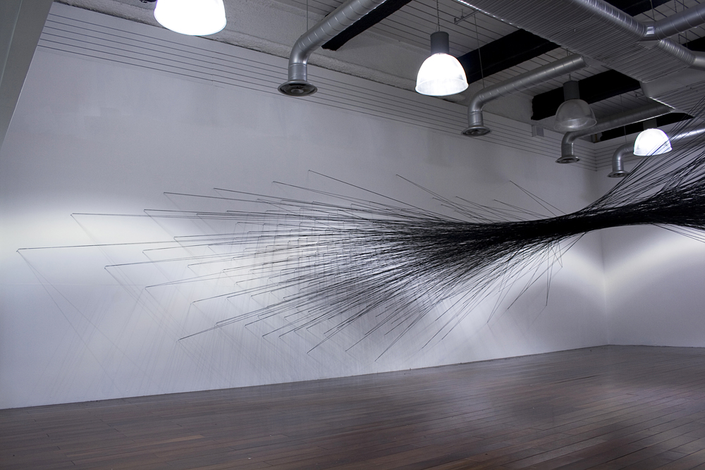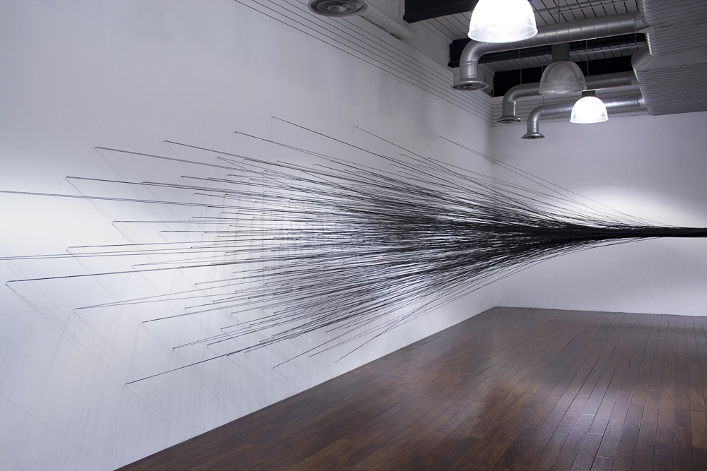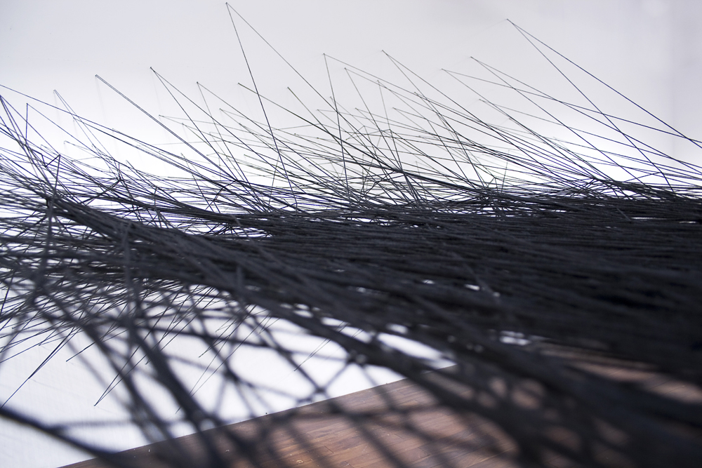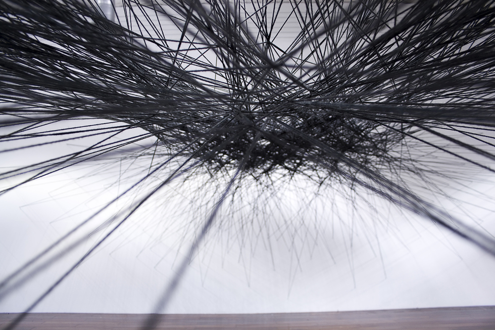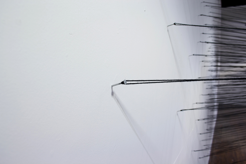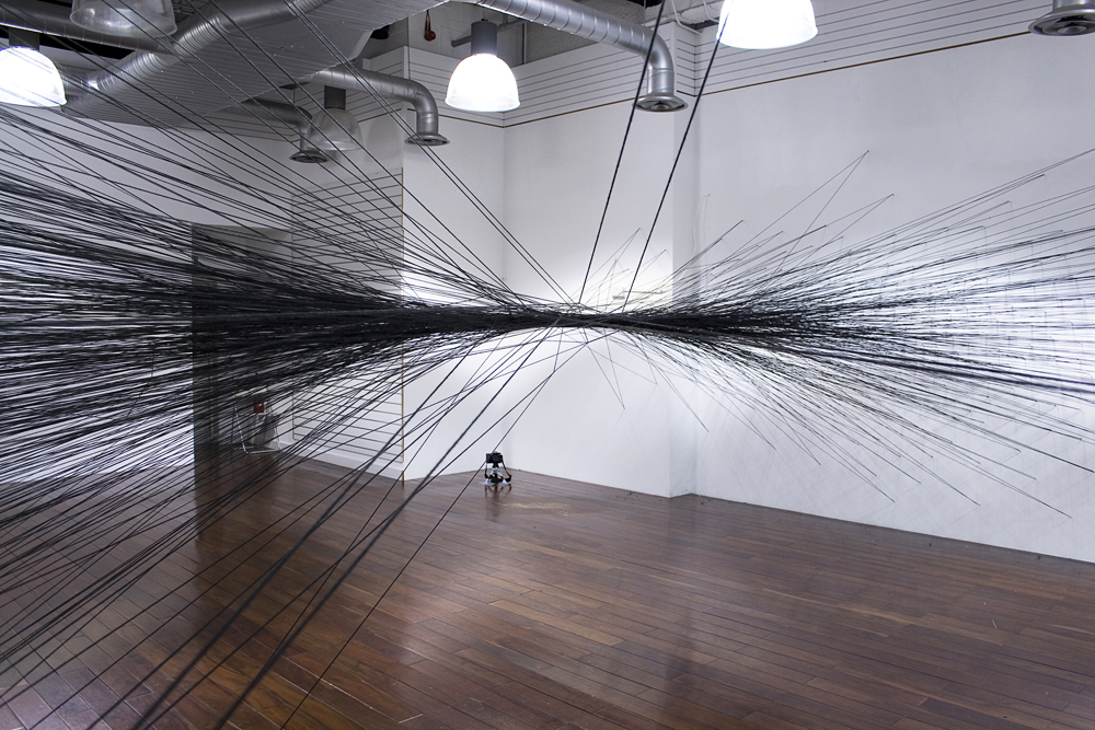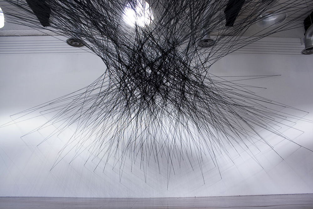 The work was constructed from material sourced in the shopping centre. Its form was dictated by the properties of this material and Rich's attempt to locate and build towards the centre of the room using the outdated navigational method of dead reckoning, which uses your previous position, your estimated speed and your assumed direction to plot your current location. This method can easily become inaccurate as speed is not constant and drift cannot be accounted for - errors become compounded.