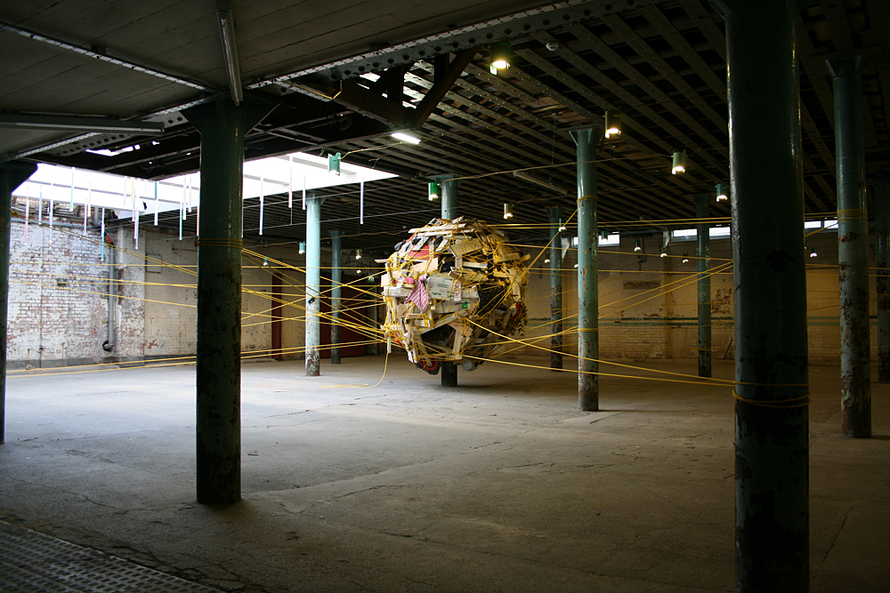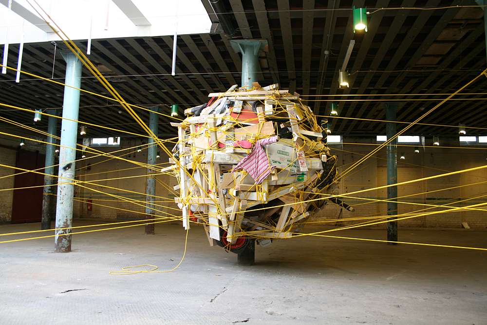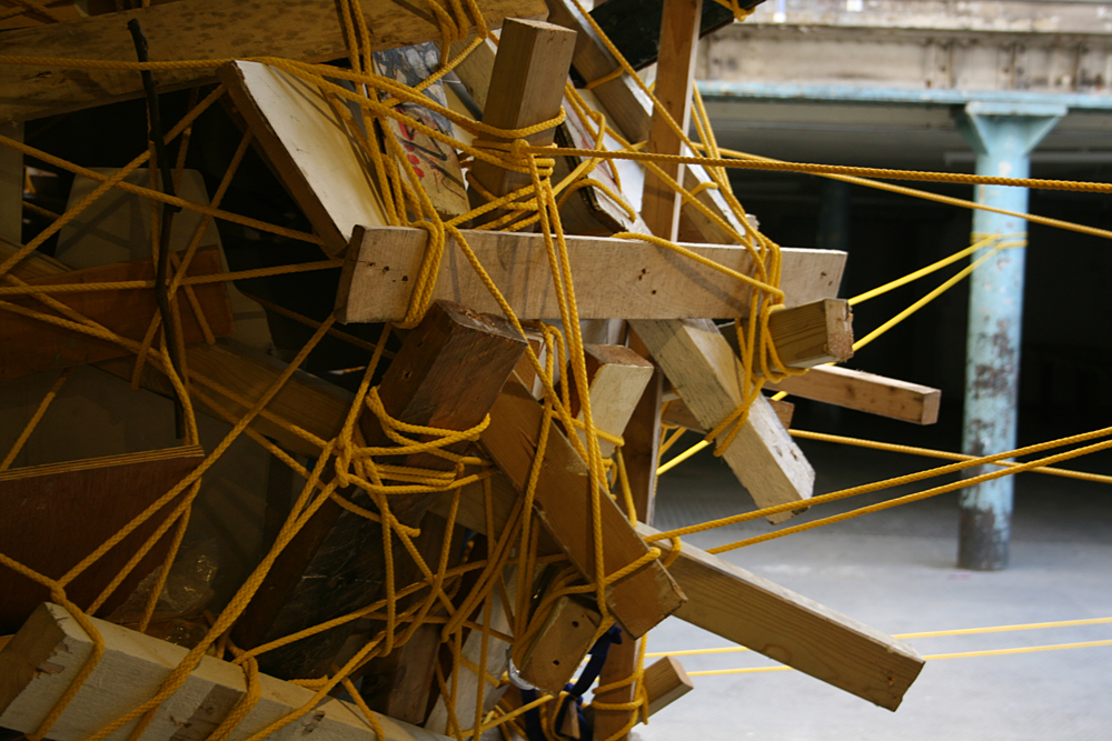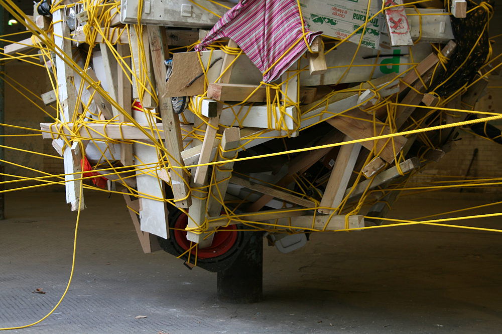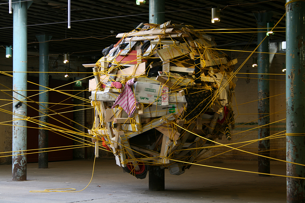 The nest was constructed from objects and items that were found discarded around the location and on journeys to the site. Rich also encouraged visitors to bring items with them (or once they had witnessed the work to go out and return with something they had found) for inclusion in the structure. The nest was suspended from the pillars and bound together with a continuous 1km line of rope.