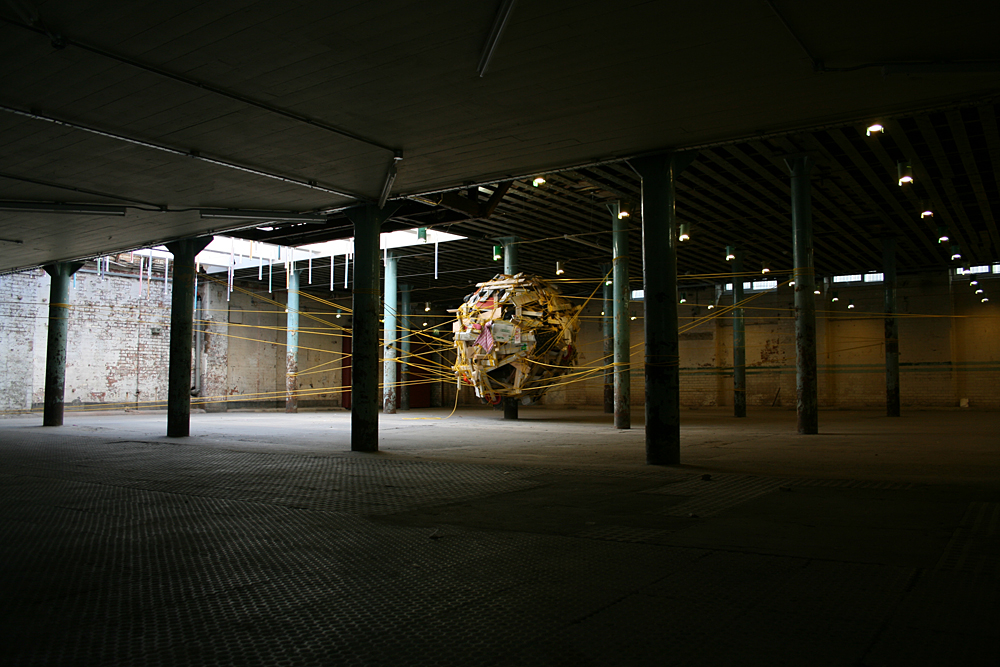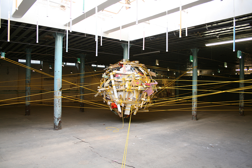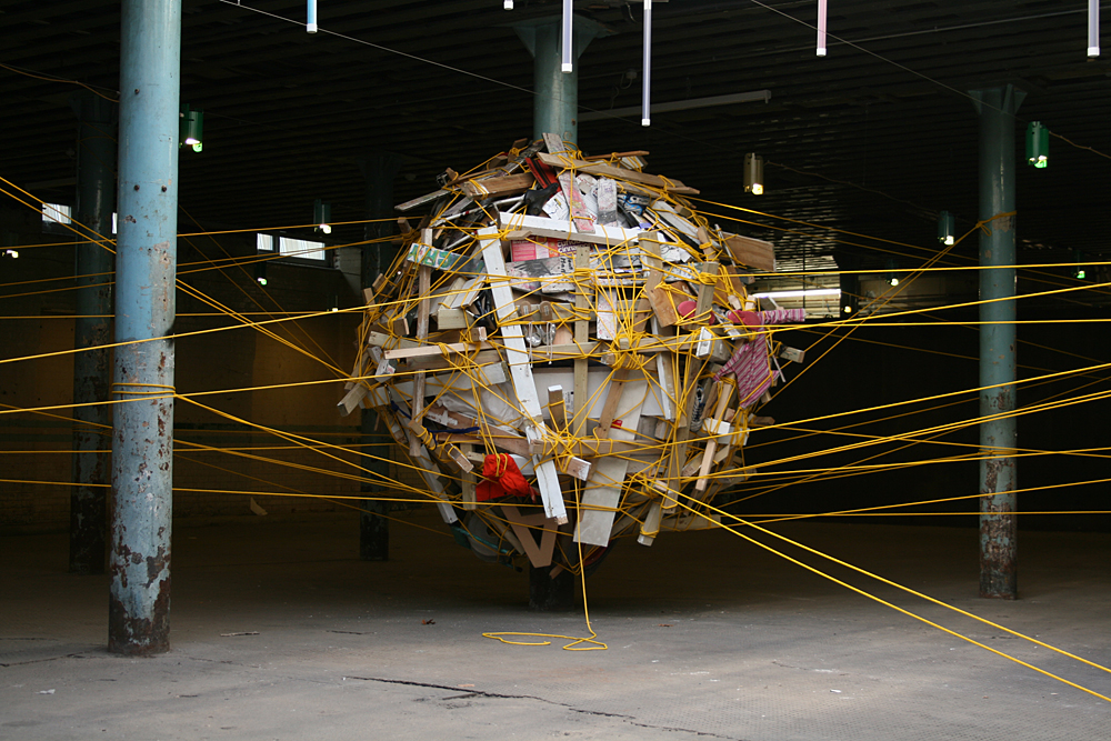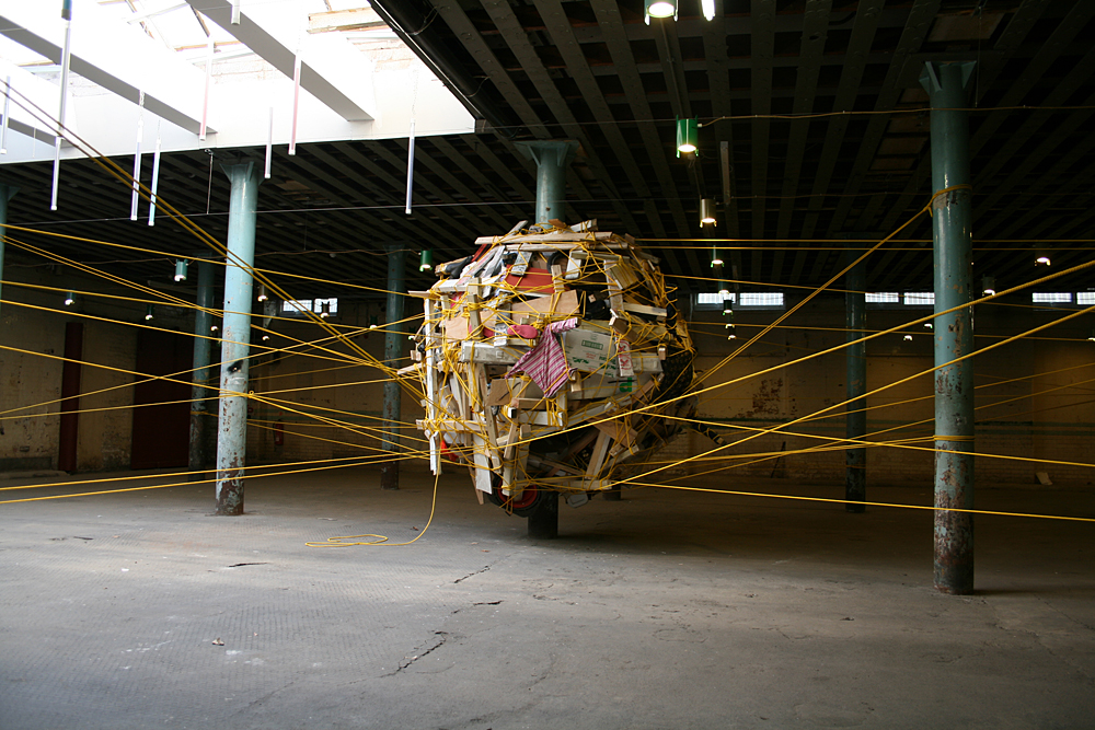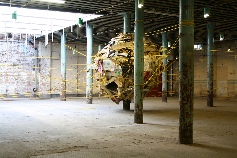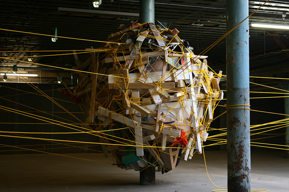 The nest was constructed from objects and items that were found discarded around the location and on journeys to the site. Rich also encouraged visitors to bring items with them (or once they had witnessed the work to go out and return with something they had found) for inclusion in the structure. The nest was suspended from the pillars and bound together with a continuous 1km line of rope.