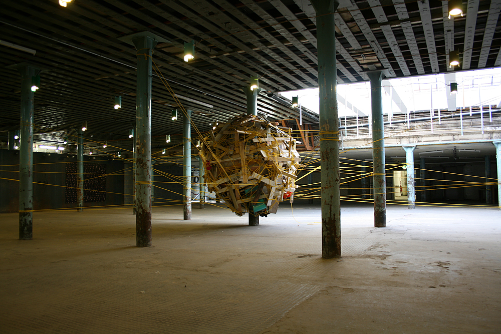 An eight day live build during which Rich constructed a human-sized nest - similar in form to a spherical weaver bird nest - suspended from the pillars of Testbed 1.